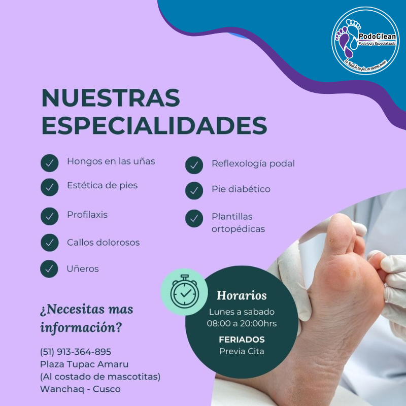 Podoclean es un centro especializado en cuidado podológico integral, comprometido con ofrecer tratamientos efectivos y personalizados para mantener la salud y el bienestar de nuestros pacientes. Con un enfoque profesional y humano, nos aseguramos de que cada paso sea cómodo y sin dolor, ayudando a prevenir problemas futuros y mejorando la calidad de vida de quienes confían en nosotros.